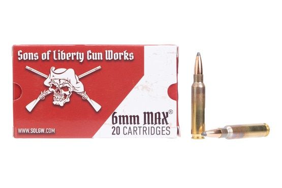 Sons of Liberty Gun Works 6mm MAX ammunition was designed from the ground up to maximize performance and reliability, pushing the limits of what the AR-15 is capable of without needing to resort to expensive specialty components. Designed to function with standard full-mass M16 bolt carrier groups and bolts, the 6mm MAX uses .350 Legend compatible magazines to push case capacity up to an impressive 37 grains of water. This high capacity means it can push the 85gr Speer jacketed soft point bullets at impressive velocities for reliable effect on target and excellent accuracy to boot. Each box holds 20 rounds.