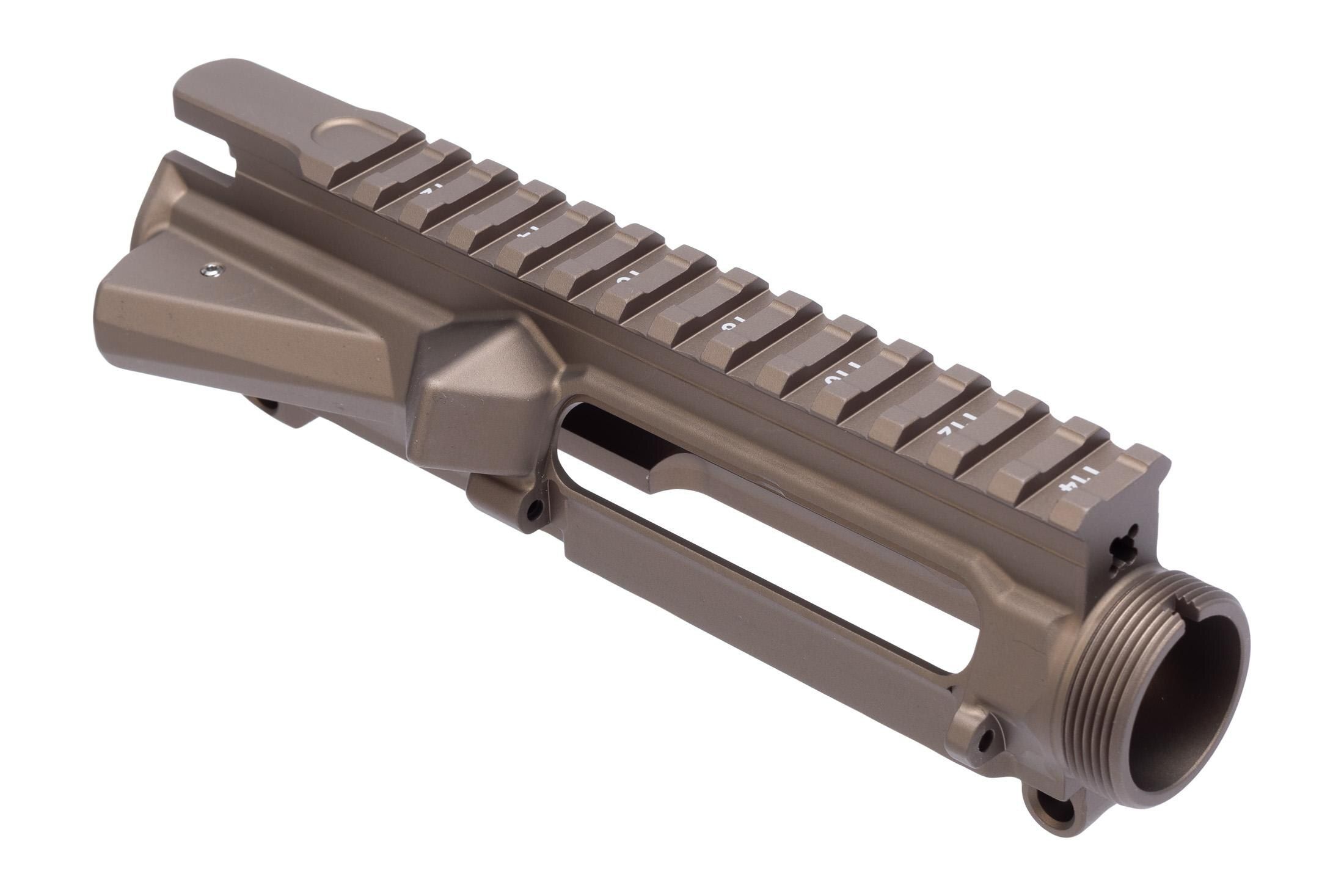 The Aero Precision M4E1 Threaded Stripped AR-15 upper receiver is forged from 7075-T6 Aluminum, precision machined to work with all mil-spec AR15 components and lower receivers. It is designed to pair perfectly with the enhanced body profile of the M4E1 Lower Receiver, giving you a billet-looking receiver set at a fraction of the billet price. This upper has been treated with a durable Kodiak Brown hardcoat anodized finish.