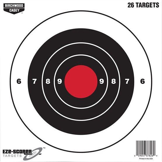 Hit the mark every time with Birchwood Casey EZE-Scorer Target Bullseye 8 in. 26 pk. These brilliant, bright white paper targets are designed to elevate your shooting experience to the next level. Whether you're honing your skills or gearing up for a sight-in session, these targets are the perfect companion for every shot. The pack includes four 3" shoot-N-C Reactive Targets, ensuring that you're always ready to take aim and fire with precision.