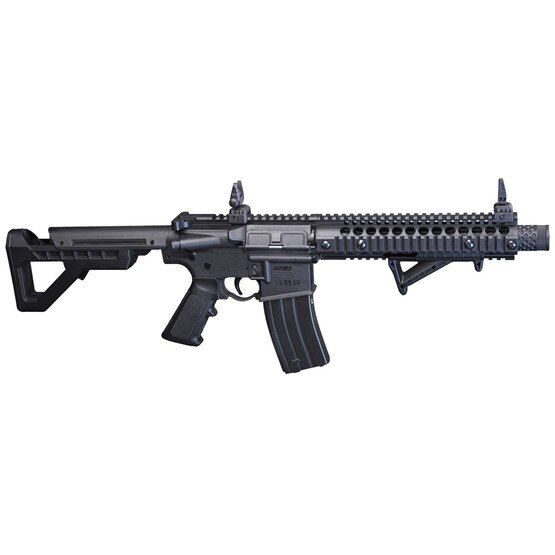 Unleash the thrill of rapid-fire action with the Crosman DPMS SBR Full Auto Air Rifle. This CO2 powered BB gun is designed for maximum tactical excitement, featuring a short barrel, blowback action, and a 6-position butt stock for customizable comfort. The pistol grip and quad rail forearm provide enhanced control and versatility, while the 30-round drop magazine ensures you stay locked and loaded for extended play. With the option for full auto or semi-auto mode, this air rifle offers an adrenaline-pumping experience for enthusiasts of all levels.