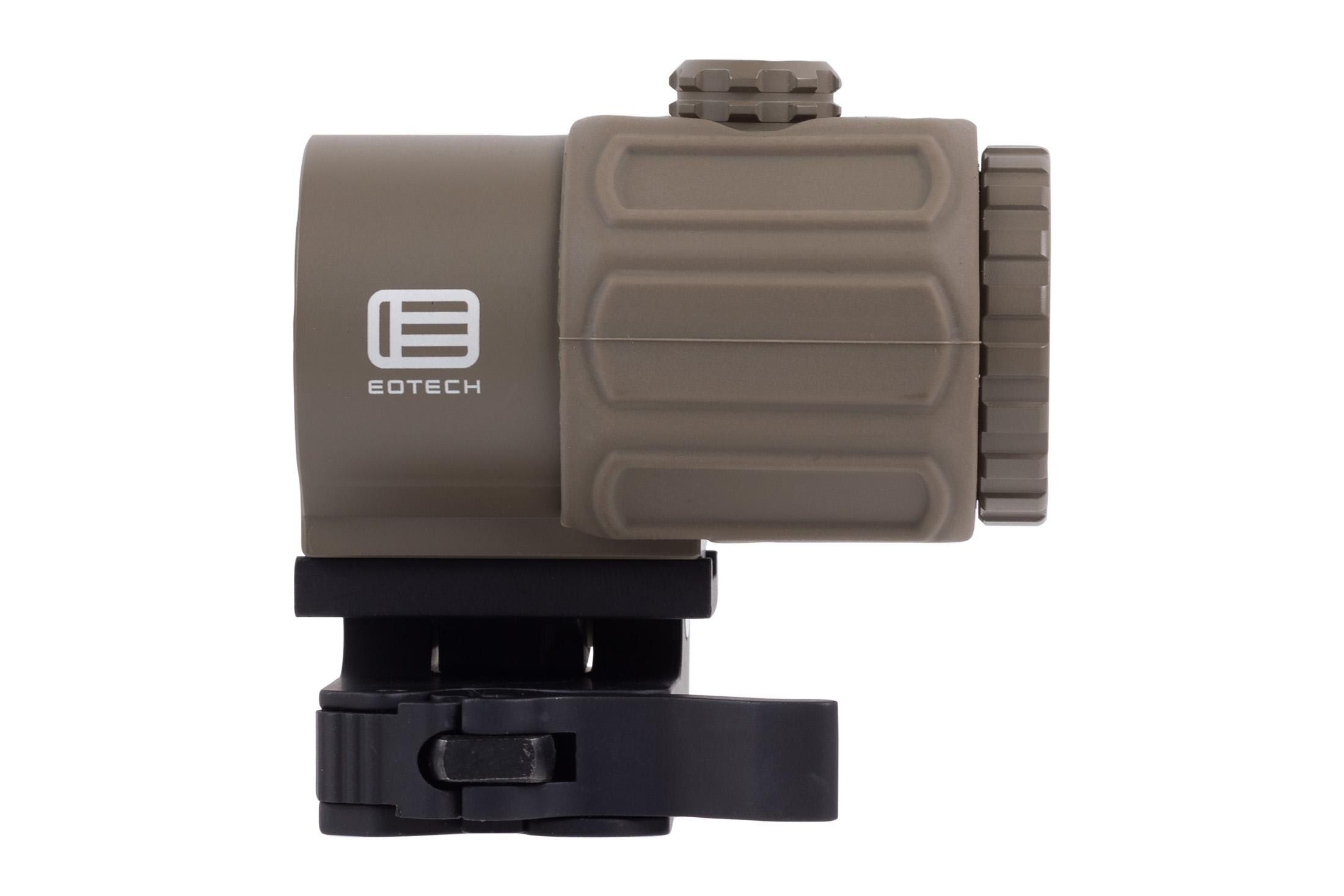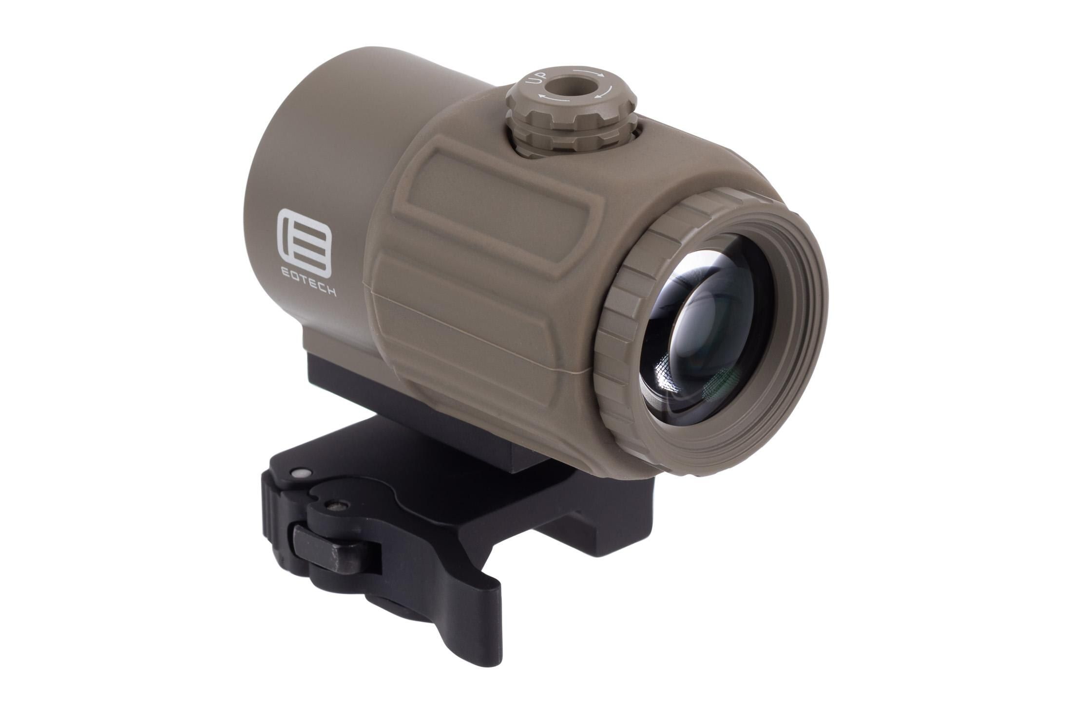 The EOTECH G43 3x Magnifier in Tan is perfect for shooters needing to add a little magnification behind their red dot sight. While the red dot provides rapid target acquisition in close to mid-quarters, the G43 magnifies the sight picture for easy, long-distance target identification. This mini 3x magnifier features a lightweight, compact design with durable construction for heavy-duty use. It includes a switch-to-side mounting system for fast magnification transitions when extra power is needed and seconds count. It allows tool-free adjustments that can be made vertically or horizontally for the perfect sight picture and has a large field of view.