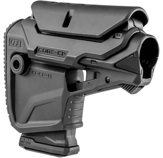 The F.A.B. Defense GL-CORE M CP is an adjustable, versatile AR-15 stock with an adjustable cheek riser and built-in magazine carrier, capable of securely holding an additional AR-15 magazine. This black stock is constructed from fiberglass-reinforced polymer composite and is compatible with both Mil-Spec and Commercial buffer tubes. The GL-CORE M CP features a built in magazine carrier, allowing shooters to keep an additional magazine in reserve and close at hand. The adjustable cheek piece is ideal for use with optics and does not interfere with the length of pull adjustment.
