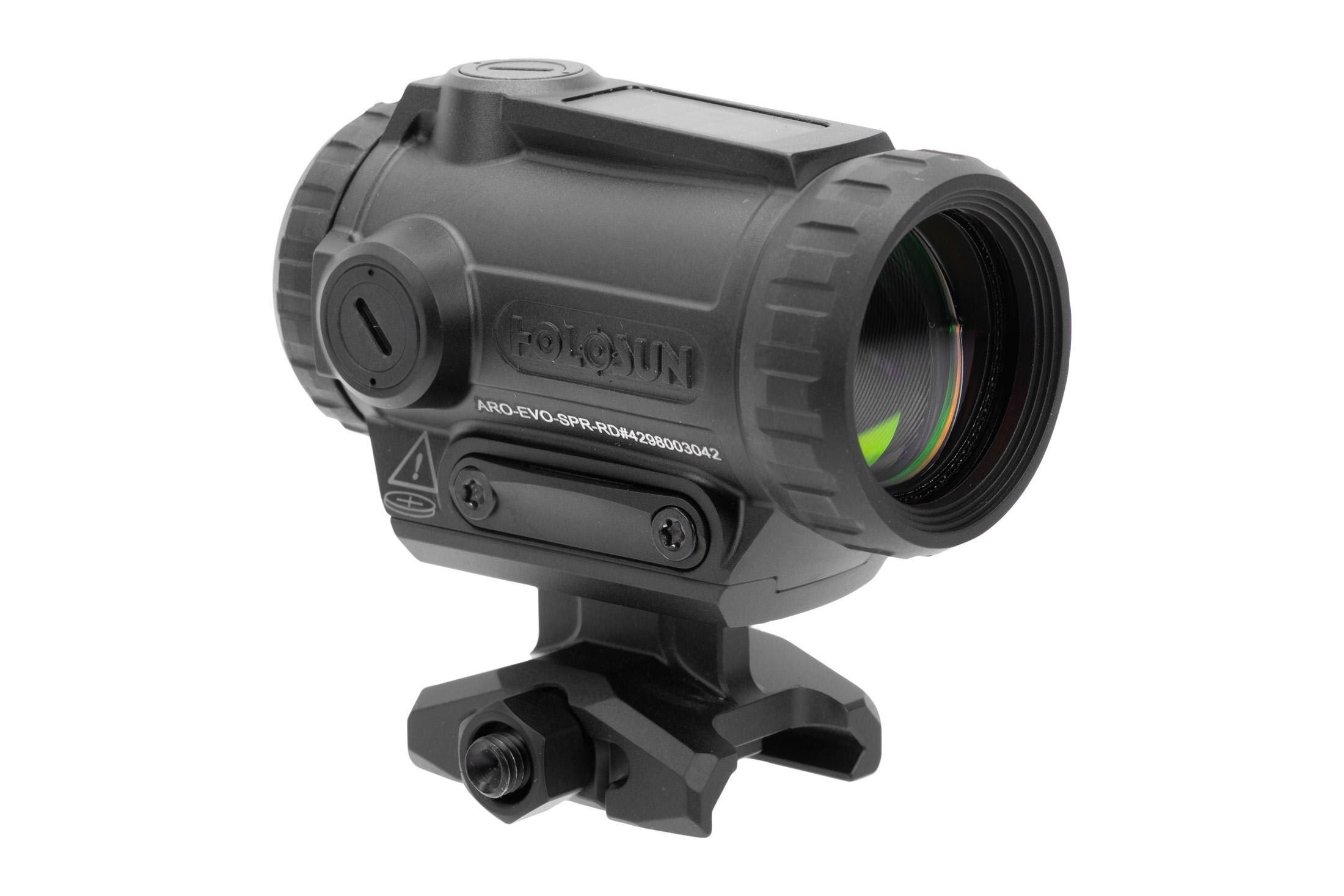 The Holosun ARO-EVO is an advanced optic with a 26mm housing to enhance target acquisition through a larger viewing window. This red dot utilizes solar battery enhancement and Shake Awake technology, providing up to 50,000 hours of runtime from a CR2032 battery. Equipped with a Special Purpose Reticle (SPR), the optic combines a 2 MOA dot with bullet-drop compensation for improved accuracy at mid-range distances. This red dot features 12 brightness levels (8 for daylight and 4 for night vision), parallax-free aiming, and unlimited eye relief. The ARO EVO is constructed from durable 6061 aluminum, is IPX8 waterproof rated, corrosion-resistant, and capable of operating in temperatures from -30℃ to 60℃. Additional features include a lower 1/3 co-witness mount, a lens cap, and an anti-reflection device.