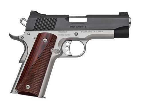 The Kimber Pro Carry II Two-Tone 9mm Handgun is built for reliability and performance. Chambered for 9mm Luger, this 1911-style pistol features a 4-inch barrel and a full-size frame. The aluminum frame is finished in satin silver, providing a durable and attractive appearance. The low-profile design and smooth/checkered rosewood grips ensure comfortable handling.