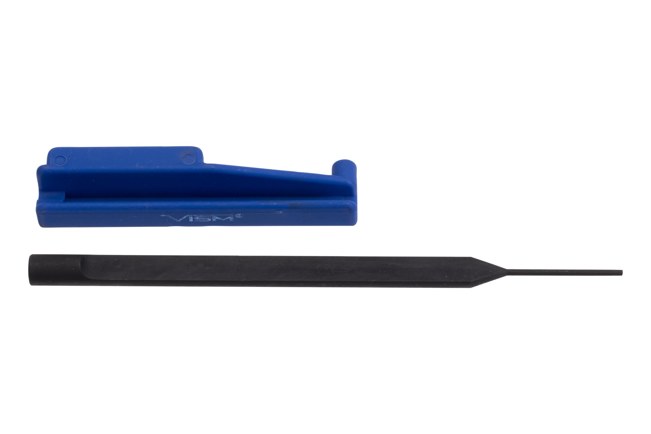 Featuring a high-quality polymer drift punch guide jig, this tool assists in guiding the included steel punch onto the roll pin with precision. By using the guide jig, gunsmiths can ensure that the receiver finish is not damaged during the installation process.