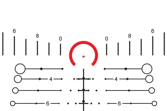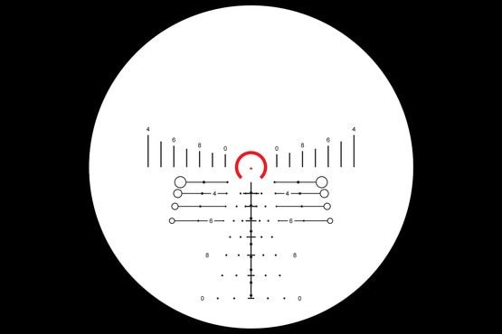 The ACSS® HUD DMR .308 reticle is a purpose-built DMR-style reticle, optimized for rapid and intuitive shooting with .308 Winchester and similar ballistic profiles. At the center is a precise chevron aiming point, surrounded by a bold horseshoe that enables fast target acquisition in close- to mid-range engagements. This reticle goes beyond traditional crosshairs by integrating an advanced ballistic drop compensation system, calibrated for ranges out to 1,000 yards. It features a built-in ranging ladder, moving target leads, and wind hold indicators—giving shooters the tools to engage confidently without needing to dial or reference external data. Designed for real-world utility, the HUD DMR delivers a complete firing solution in a single, easy-to-use sight aiming system.