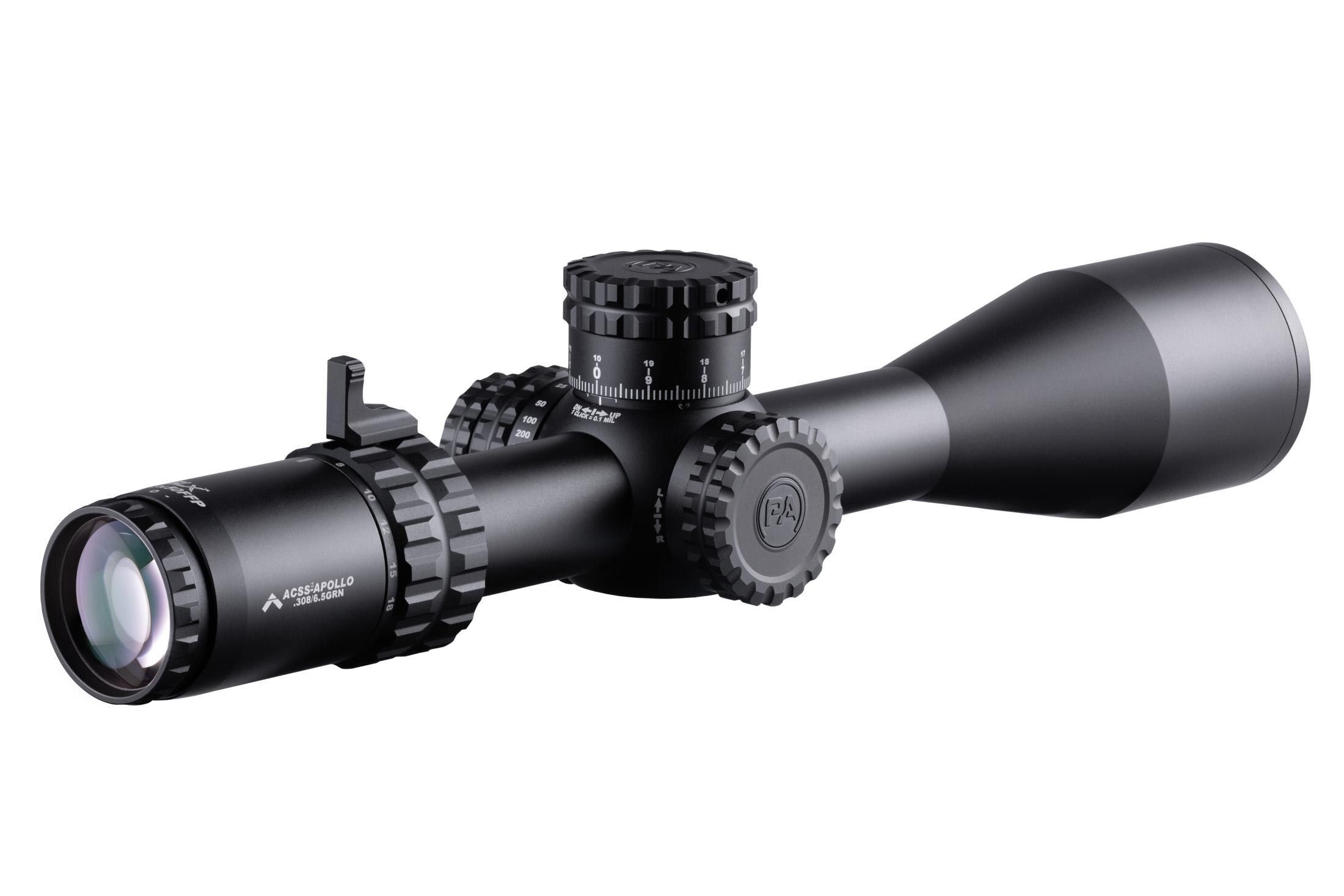This 3-18x50mm GLx scope is equipped with the first focal plane ACSS APOLLO .308/6.5 Grendel reticle, simply the ultimate option for .308 Winchester or 6.5 Grendel shooters available. Simply sight in at 100 yards and you are ready to engage at any range out to 1,000 yards with crosswinds up to 20 mph, all without requiring any math or touching a single turret. Combine the built-in range estimation and hold overs with an infinitely precise chevron tip aiming point and .2 MIL crosshair subtensions, and you have a firing solution at any distance.