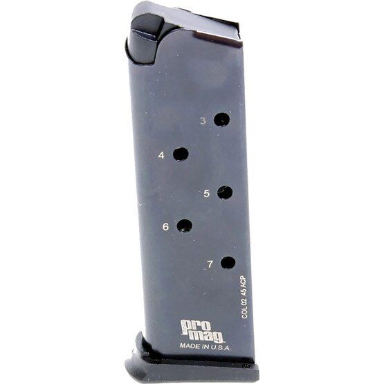 Elevate your shooting experience with the ProMag Steel Magazine 1911 .45 ACP Blued 7 rd. Specifically designed to fit 1911 Government Model .45 ACP pistols, this magazine is a game-changer. Crafted from heat-treated steel with a sleek black oxide finish, it exudes durability and style. The injection-molded magazine follower and heat-treated chrome silicon wire spring ensure smooth and reliable performance. Made in the USA, this magazine is a testament to quality and precision engineering.