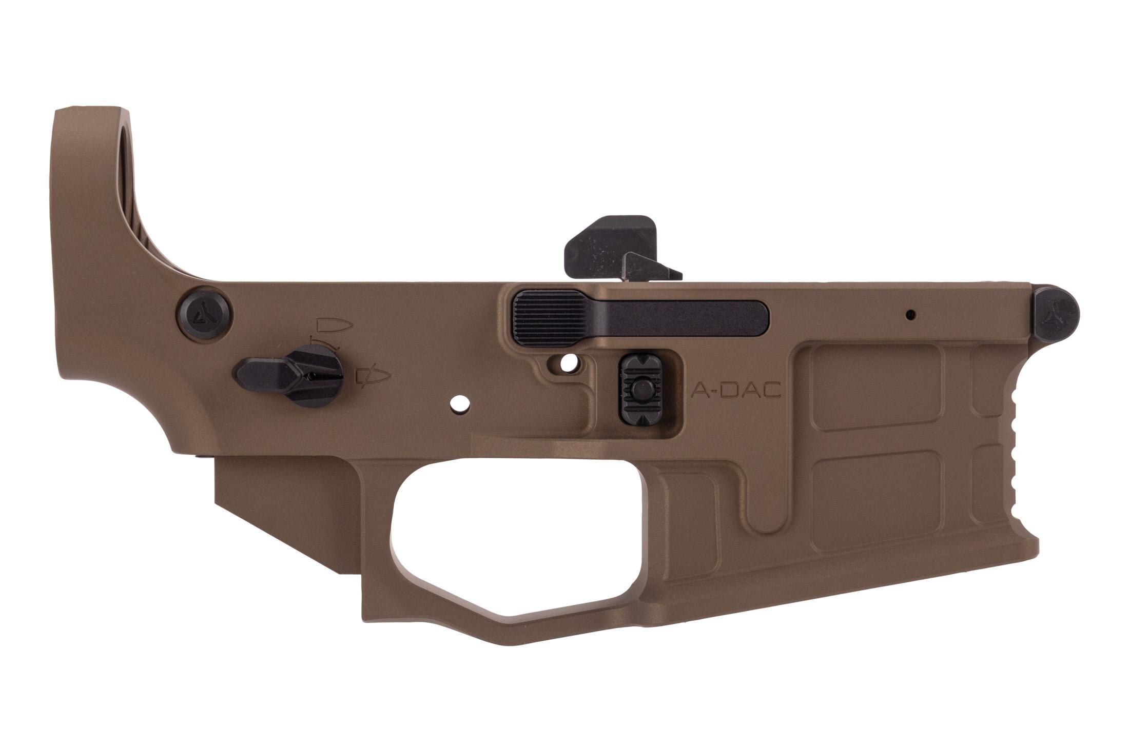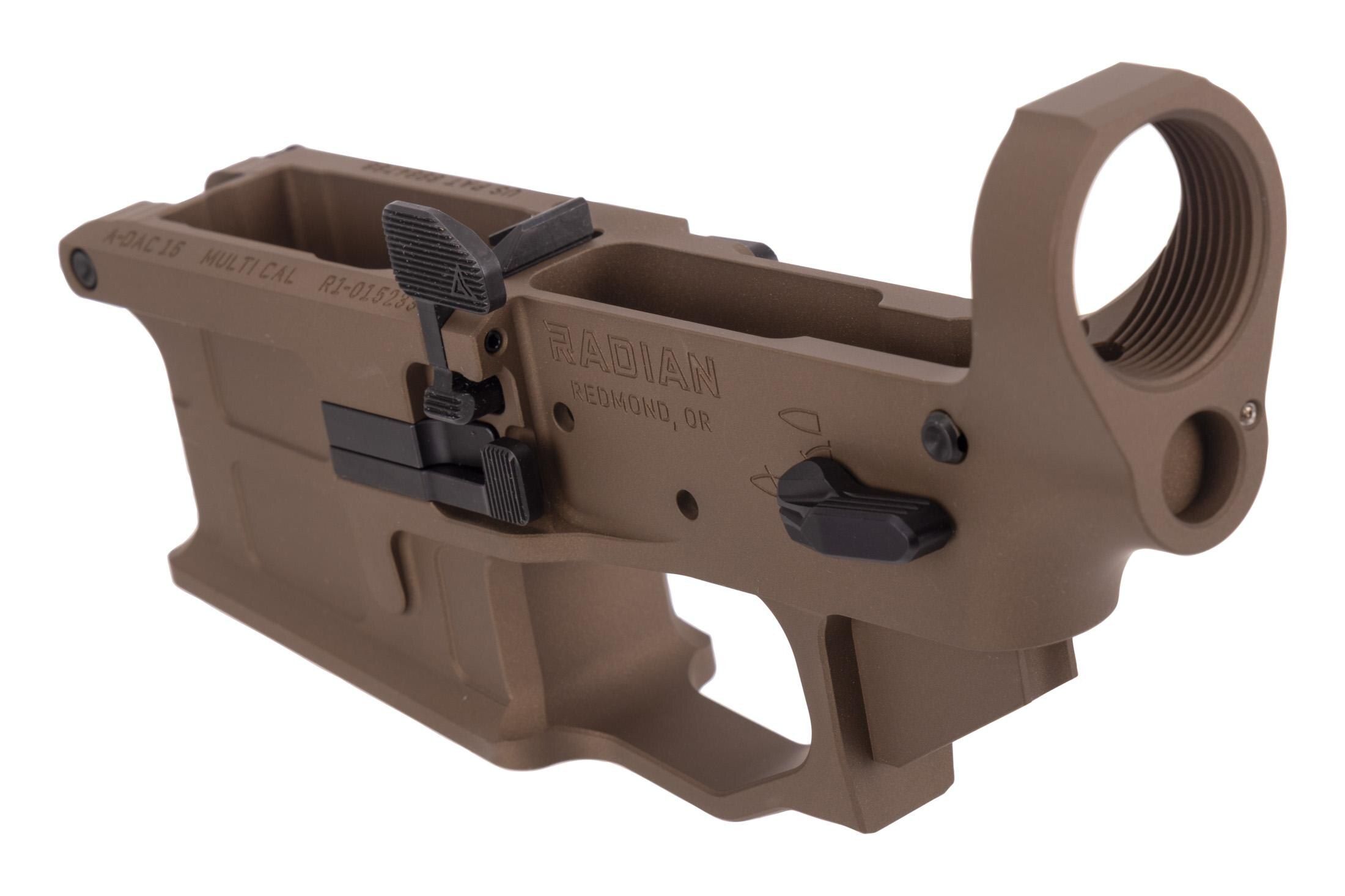 The Radian Weapons A-DAC 15 Lower Receiver in Radian Brown makes a great base for your next AR-15 build. This fully ambidextrous lower is precision machined from billet 7075-T6 aluminum with a Radian Brown Cerakote finish. It features an integral trigger guard and flared magwell for fast, easy magazine changes. It comes equipped with the Talon 45/90 ambidextrous safety selector, a left-side magazine release, a right-side bolt catch, and the patented Ambidextrous Dual Action Catch (A-DAC). With advanced features like the self-adjusting receiver tensioner, an enhanced takedown pin set, and all proprietary hardware included, the A-DAC 15 Lower Receiver is the perfect choice for your next build.