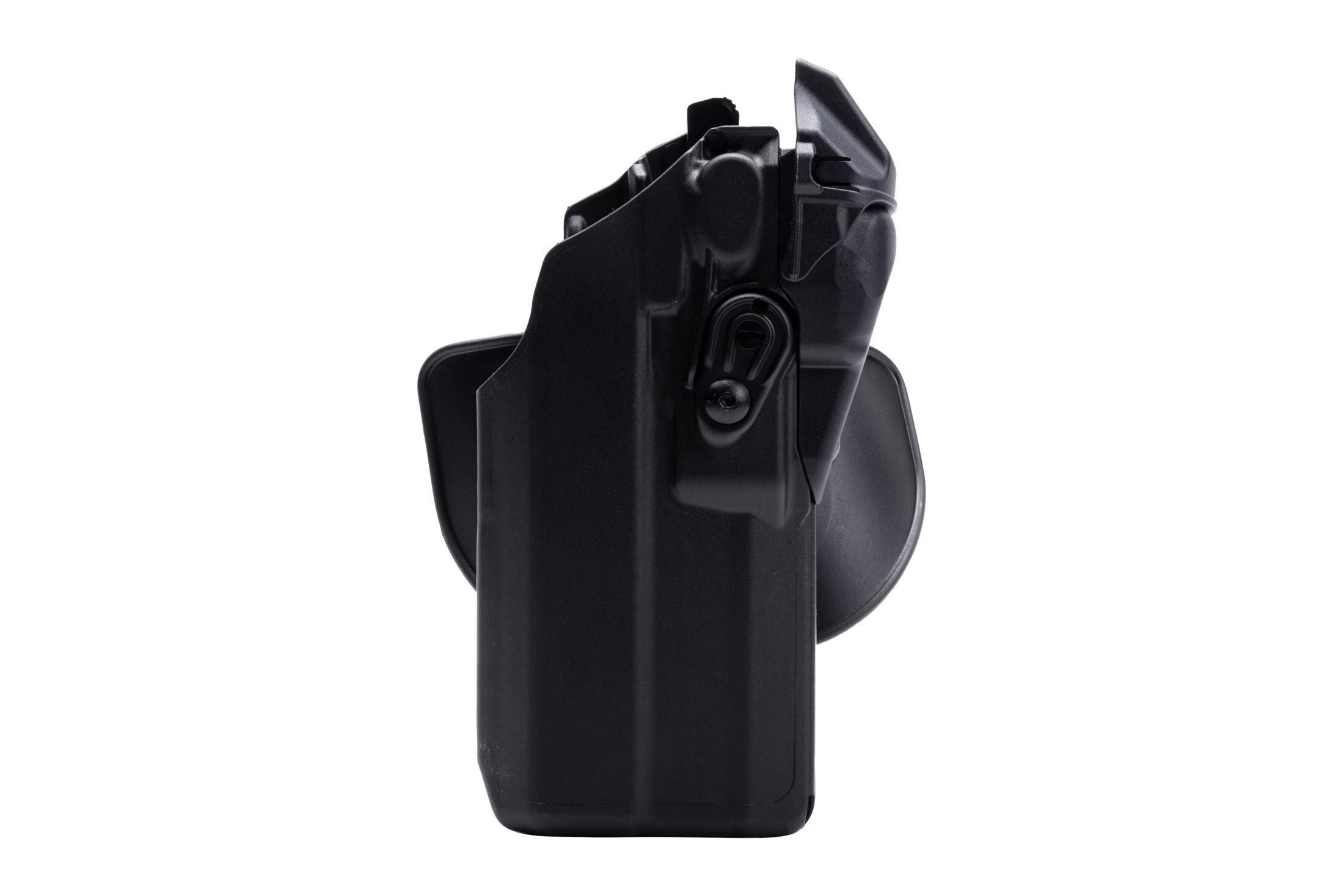 This right-hand duty holster from Safariland features its standard Automatic Locking System retention system. The ALS keeps the firearm secure once holstered and requires a straight-up raw once deactivated for release. The included paddle and injection-molded belt loop allow a close fit to the body for easy concealment. Easily adjust the belt loop for cant and retrieve your weapon quickly with the open-top design. This holster is compatible with firearms equipped with red dot optics. The holster is thermal-molded to protect your handgun and keep it in your control.
