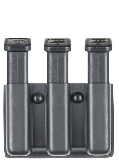 The Safariland Model 775 NP is an open top top magazine pouch that holds up to three Glock 17 or 22 magazines with retention and a slim design. Features MOLLE or belt loop compatibility, Safariland's STX Plain Black finish, durable Safarilaminate construction, and a space saving bullet out orientation.