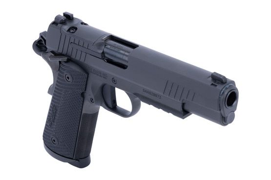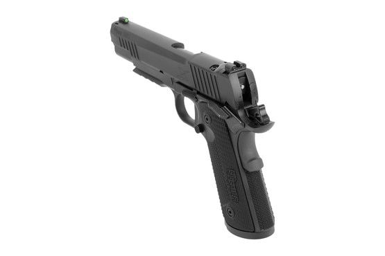 The SIG Sauer 1911-XFULL's full size government frame is also host to great features that improve the iconic design. The undercut frame allows for a higher, more ergonomic grip to better manage recoil. Both the slide stop and ambidextrous safety have been improved. An integrated accessory rail has been added to accept your favorite lights and lasers. Even reloading has been improved thanks to the removeable flared magwell, allowing for more consistent insertion of the included 8-round magazines. Add in custom G10 grip scales by LOK Grips and you've got a truly modern and capable handgun.
