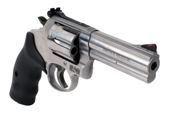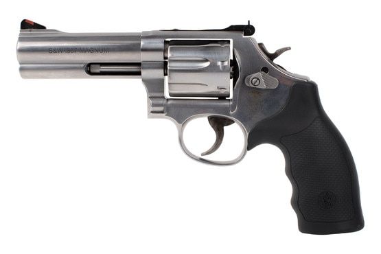 The Smith & Wesson Model 686 Plus .357 Magnum Revolver with its L-frame design is suited for duty or recreation. The Model 686 is a powerful revolver chambered in .357 Magnum. This Smith & Wesson offers single and double action capabilities with an exposed hammer. Smith & Wesson Model 686 is a durable and reliable firearm with a steel frame and steel barrel. Target acquisition and is quick and easy with the Model 686 Plus .357 Magnum’s red ramp front sight and adjustable white outline rear sight. It comes with a classy stainless steel finish and durable synthetic black grip. The Smith & Wesson Model 686 boasts a 4-inch barrel, 7 round capacity, exposed hammer and weighs in at 38.9 oz. The Smith & Wesson name is not the only reason this .357 Magnum stands out from the crowd. The 686 Plus is respected by police officers and hunters alike for its durable construction and powerful load.