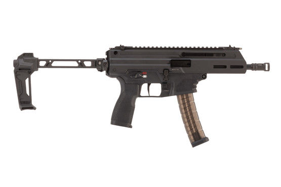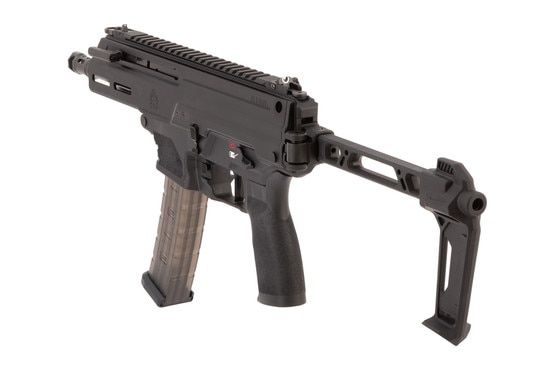 The Springfield Armory Kuna is a semi-automatic 9mm pistol designed for low-recoil performance and a compact form factor. The Kuna utilizes a roller-delayed operating system with a non-reciprocating, reversible charging handle and ambidextrous safety. This semi-automatic pistol includes a 6.125" cold radial hammer-forged barrel with Melonite finish, threaded 1/2x28 muzzle with multi-port brake, and an M-LOK handguard. The Kuna also features a Strike Industries folding brace and two 30-round magazines and is made in the USA.