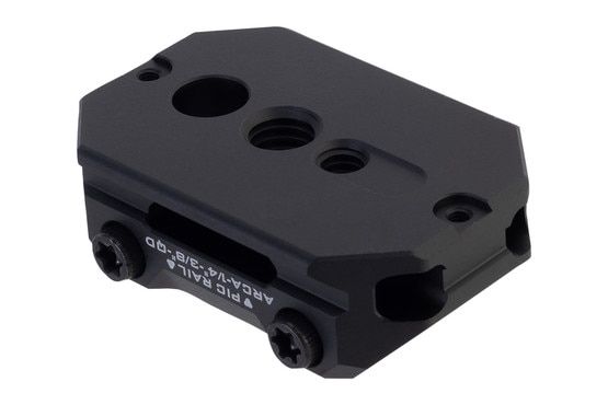 The Strike Picatinny to ARCA Adapter connects 1913 Picatinny and STANAG rails to ARCA Swiss systems. It is compatible with standard tripod mounts and includes 1/4" and 3/8" threaded options for cameras and photography equipment. The adapter is made with an aluminum housing, a steel locking latch, and a QD socket for sling use. This adapter attaches to Picatinny rails using T25 Torx screws. The adapter is lightweight, durable, and designed for secure and reliable performance.