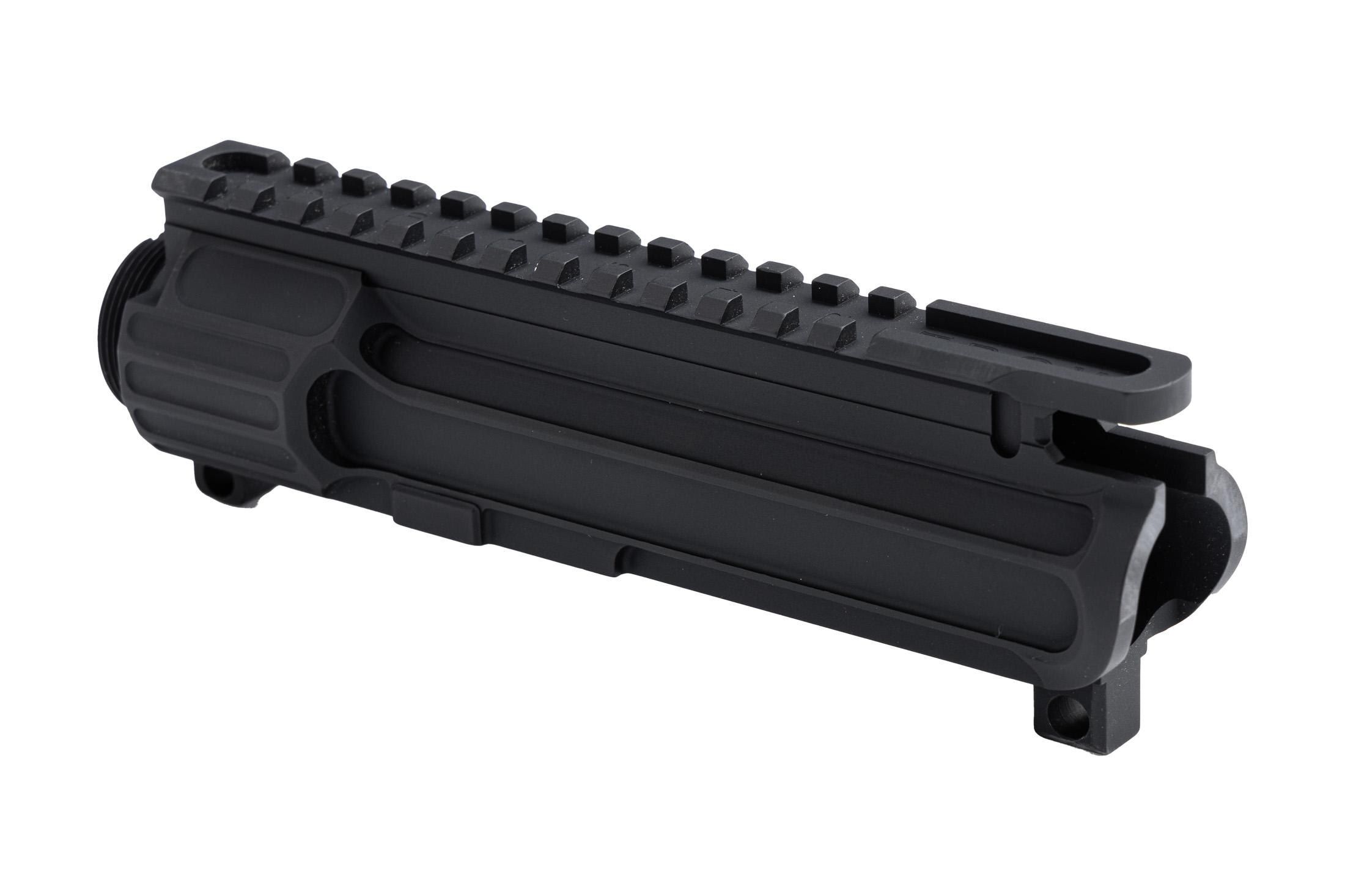Troy Industries stripped AR-15 upper receiver, precision machined billet aluminum construction with a durable and corrosion-resistant Hardcoat Anodized black finish. This upper is made in America from 6061 aircraft grade aluminum and features a slick design with no provisions for installing a forward assist, which gives the upper a slimmer profile, removing a potential point of mechanical failure, and maintaining a light weight and durable design. The hard coat anodized black finish meets MIL-SPEC. This stripped upper is an ideal match for a new AR-15 build.