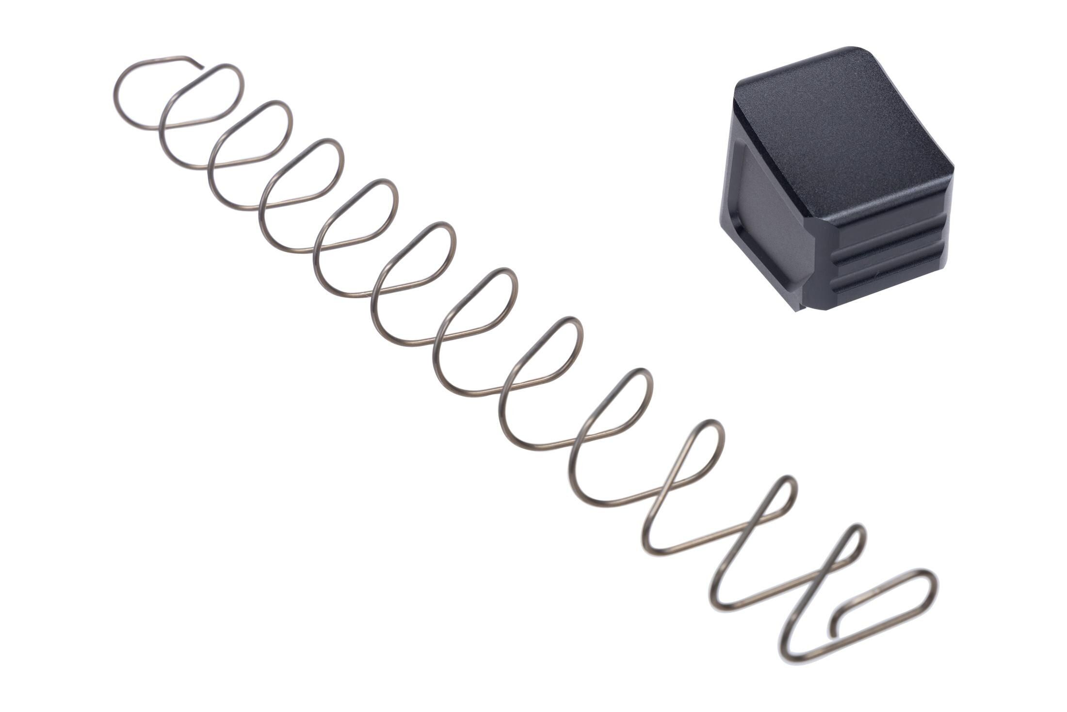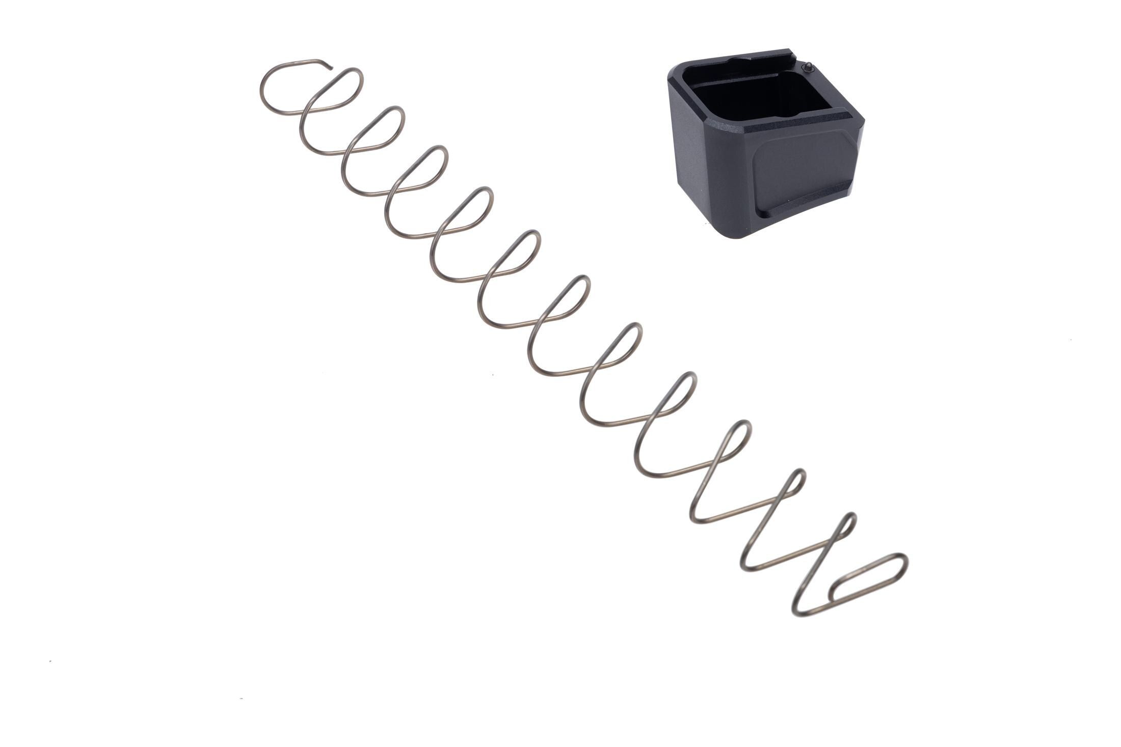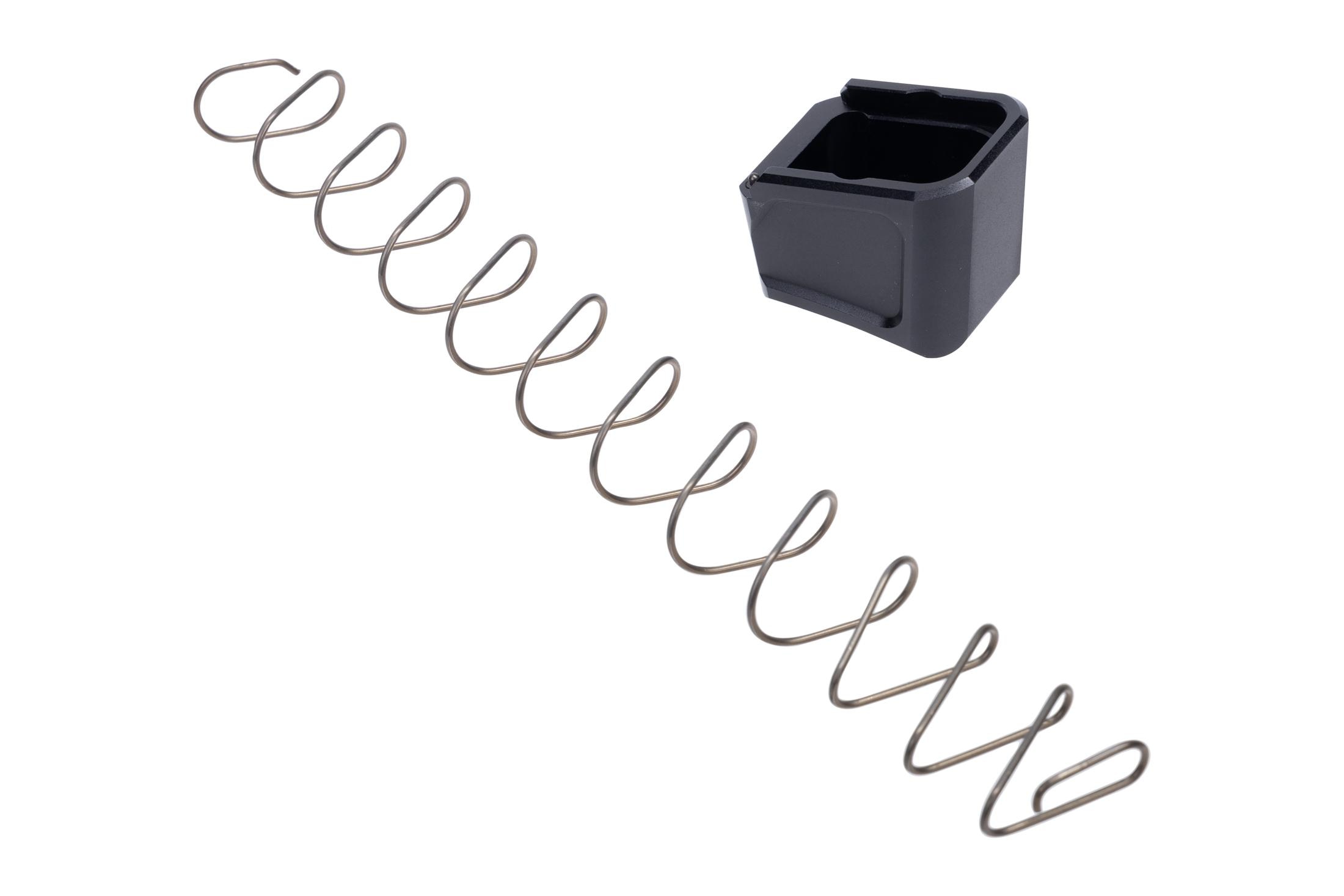 Made from CNC machined aerospace grade aluminum, the extension adds weight for a faster magazine drop. It increases capacity by 5 rounds for 9mm magazines and 4 rounds for .40 caliber magazines compatible with Glock models 17, 19X, 22, 34, 35, and 45.