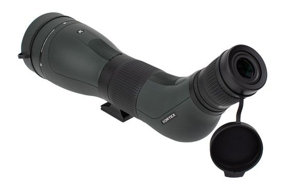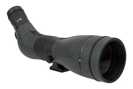The Vortex Diamondback HD 20-60x85 Angled Spotting Scope offers exceptional glass clarity, edge-to-edge sharpness, and light transmission ideal for long-distance hunting. The streamlined body design has a sleek, snag-free profile and easy to adjust helical focus wheel. Other features include ArmorTek scratch-resistant lens coating, rubber armor for a non-slip grip, adjustable eyecups, and a built-in sunshade to reduce glare.